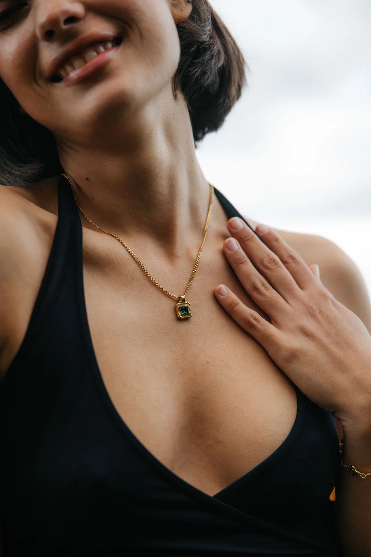 The kind of beauty you may begin to take for granted with everyday wear. Its intricacy, elegance and the central Emerald glass stone is always noted by passersby.